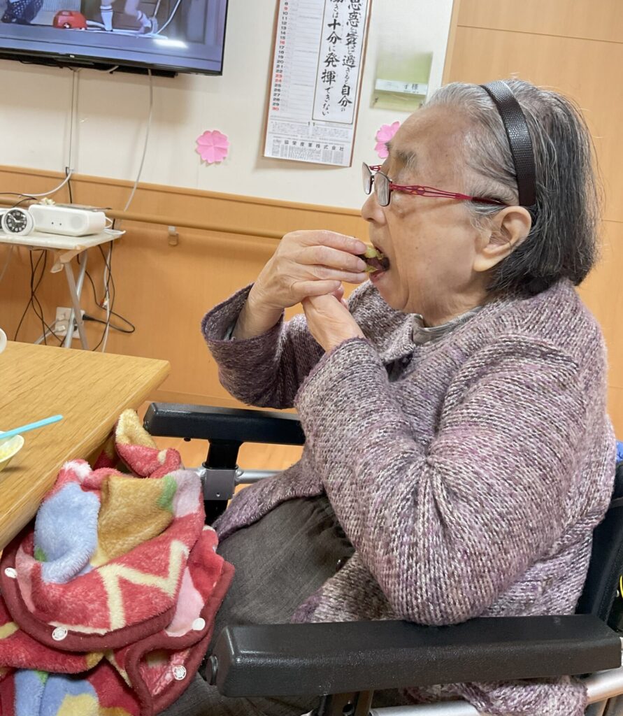 今回は昭和の名作「男はつらいよ」を上映しました。スクリーンに映る寅さんの姿に、利用者様からは「懐かしいね」「あの頃を思い出すよ」と笑顔がこぼれ、会場には温かい空気が広がりました。いつものテレビより少し大きな画面で観ることで、まるで映画館に来たような雰囲気に包まれ、皆さま思い思いに楽しまれていました。